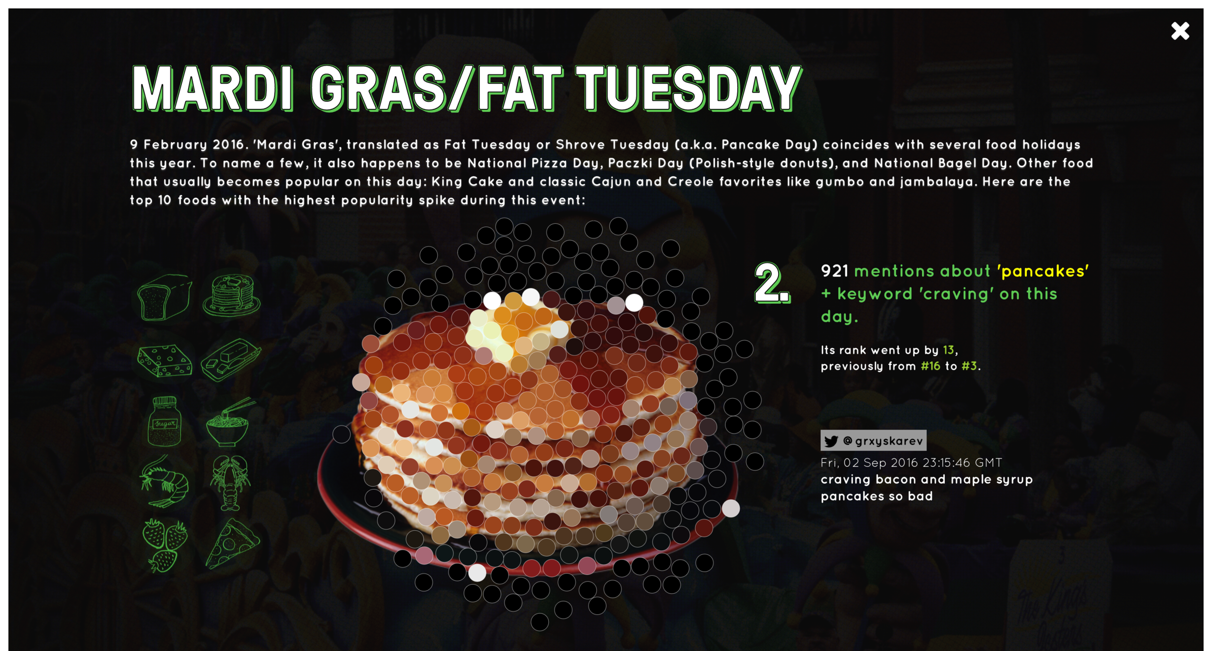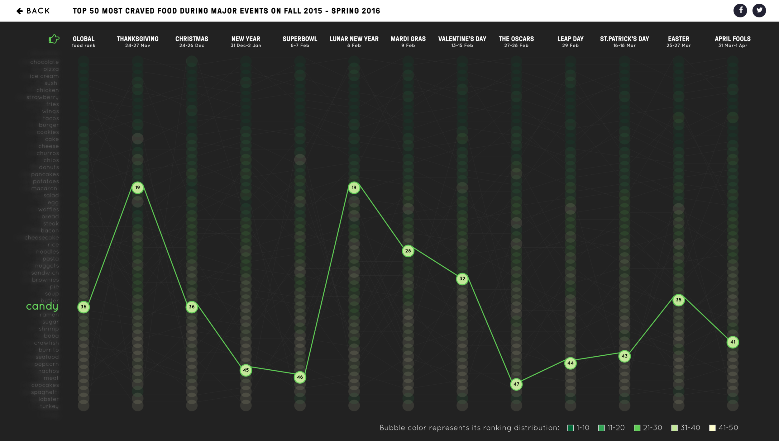 Using Bump Chart, I had the pleasure of looking at just how one food’s popularity stack up against each other and the driving forces behind it, correlated to each event. You can click on each event to see a more detailed breakdown containing tweets from the 10 food with the highest popularity spike, which brings you to a new playful interface in forms of wiggly bubbles that you can hover -- each bubble represent a tweet about particular food craving.
