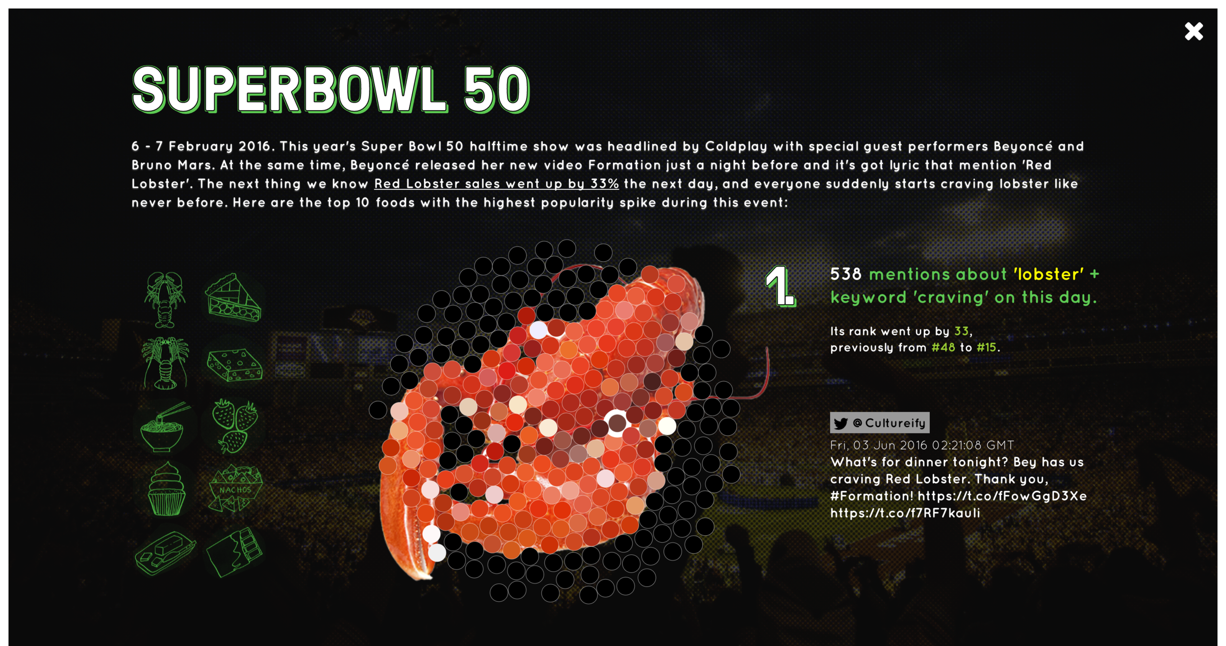 But then there were also some surprising turns. Super Bowl 50 is a great example. When traditionally most people would associate watching the event with party snacks like chicken wings and beer, this year’s Super Bowl was different (all thanks to Queen Bey!). Beyonce released her video ‘Formation’ on February 6th, 2016, one night before she performed the song at the Super Bowl halftime show. It is a powerful song that the TIME magazine mentioned as an activism for African Americans, women, and LGBTQ people8. What’s interesting is that somewhere along the lyric she intentionally stated “Red Lobster” and then suddenly the amount of people craving for lobster during this event is higher than ever. Compared to the previous event, its rank went up by 33, going from rank #48 to #15 (on a scale of Top 50 most craved food).